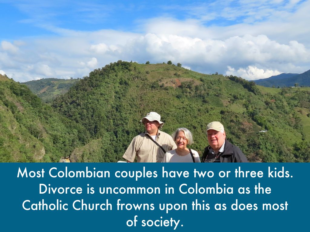 Most Colombian couples have two or three kids. Divorce is uncommon in Colombia as the Catholic Church frowns upon this as does most of society.