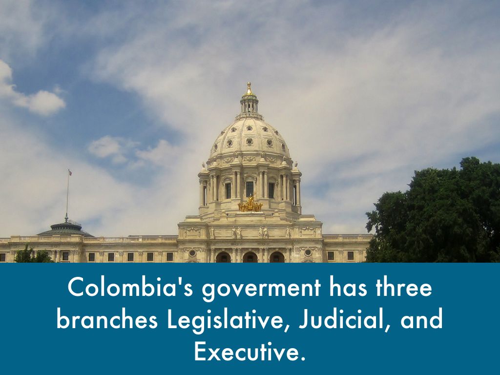 Colombia's goverment has three branches Legislative, Judicial, and Executive.