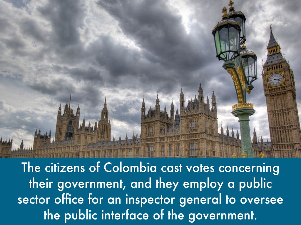 The citizens of Colombia cast votes concerning their government, and they employ a public sector office for an inspector general to oversee the public interface of the government.