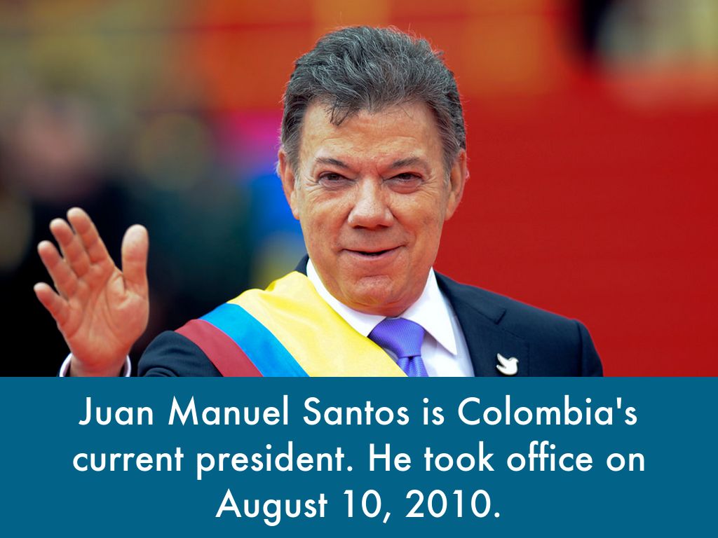 Juan Manuel Santos is Colombia's current president. He took office on August 10, 2010.