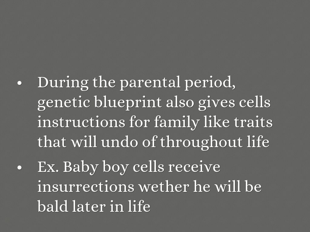 - During the parental period, genetic blueprint also gives cells instructions for family like traits that will undo of throughout life