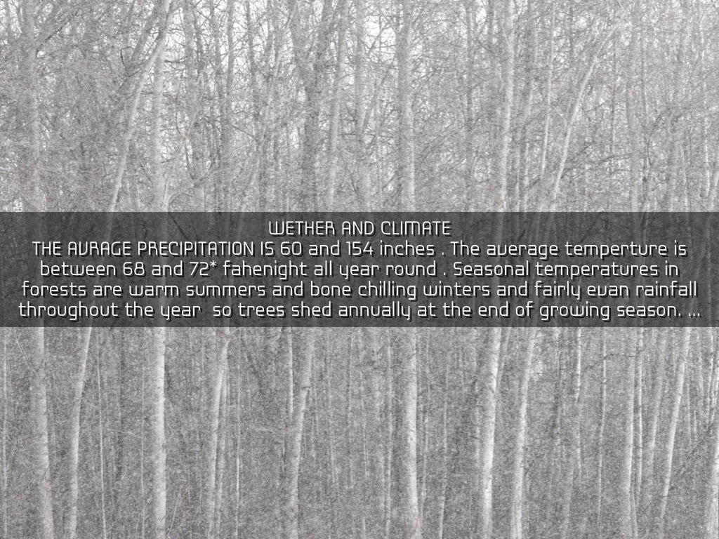 WETHER AND CLIMATE THE AVRAGE PRECIPITATION IS 60 and 154 inches . The average temperture is between 68 and 72* fahenight all year round . Seasonal temperatures in forests are warm summers and bone chilling winters and fairly evan rainfall throughout the year so trees shed annually at the end of growing season.