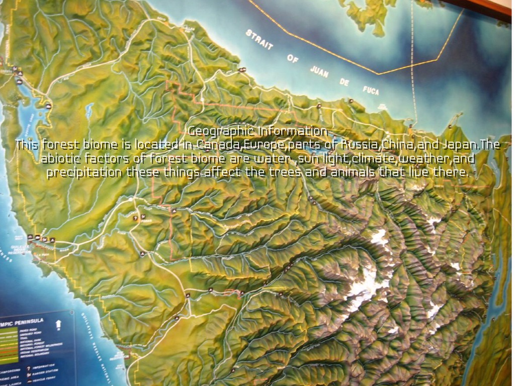 Geographic Information This forest biome is located in Canada,Europe,parts of Russia,China,and Japan.The abiotic factors of forest biome are water ,sun light,climate,weather,and precipitation these things affect the trees and animals that live there.