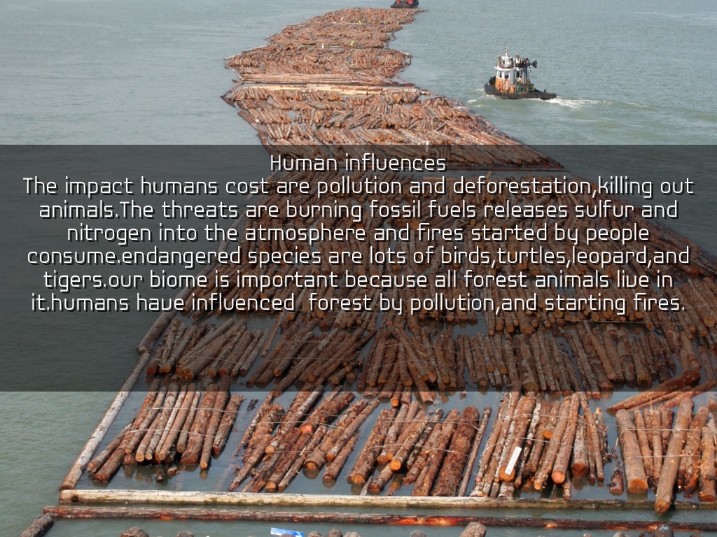 Human influences The impact humans cost are pollution and deforestation,killing out animals.The threats are burning fossil fuels releases sulfur and nitrogen into the atmosphere and fires started by people consume.endangered species are lots of birds,turtles,leopard,and tigers.our biome is important because all forest animals live in it.humans have influenced forest by pollution,and starting fires.
