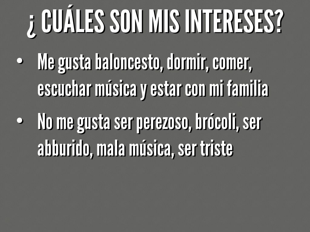 Me gusta baloncesto, dormir, comer, escuchar música y estar con mi familia