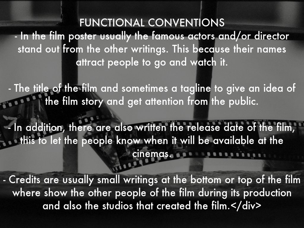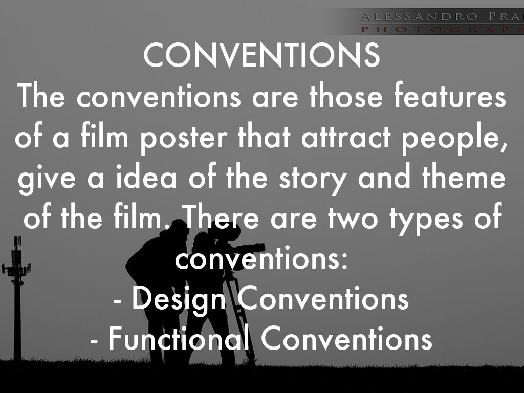 CONVENTIONS The conventions are those features of a film poster that attract people, give a idea of the story and theme of the film. There are two types of conventions: - Design Conventions - Functional Conventions