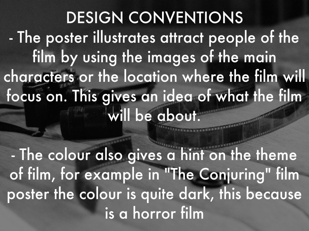 - The colour also gives a hint on the theme of film, for example in "The Conjuring" film poster the colour is quite dark, this because is a horror film