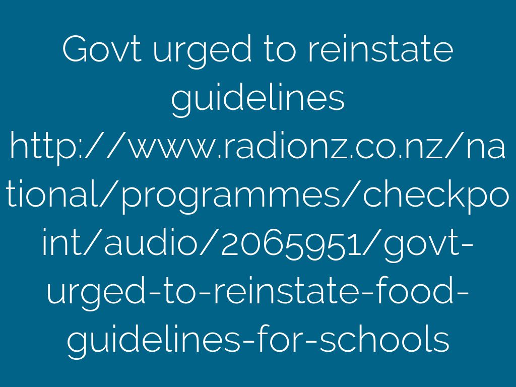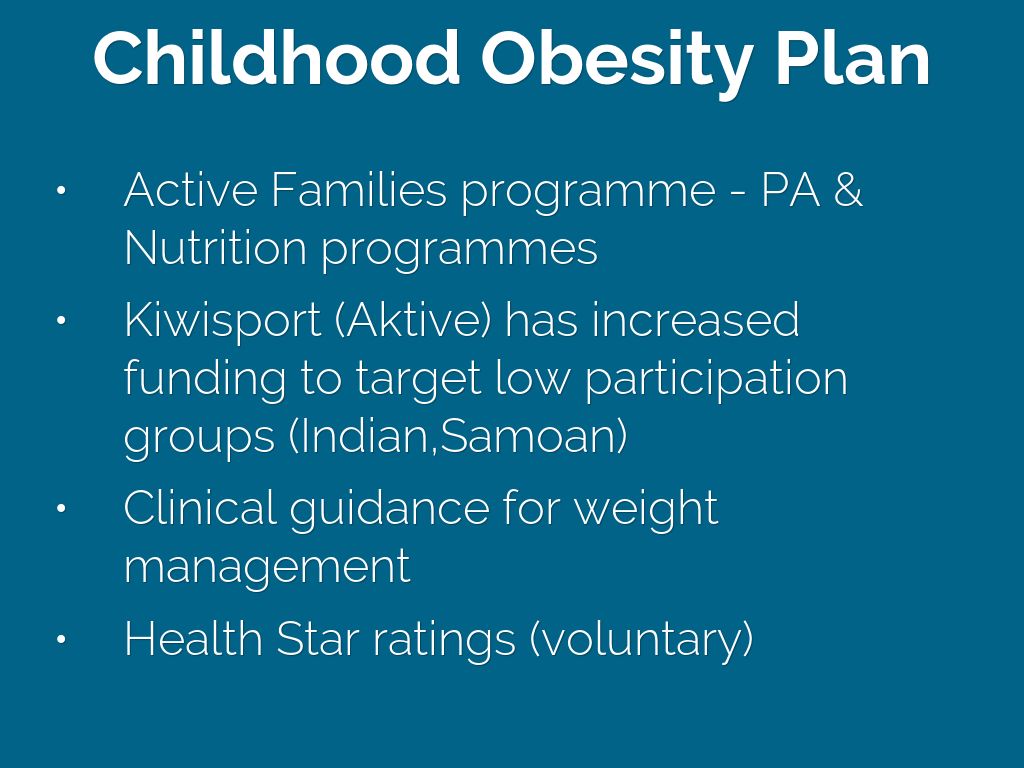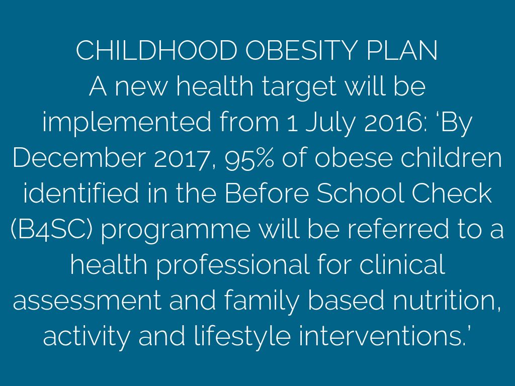 A new health target will be implemented from 1 July 2016: ‘By December 2017, 95% of obese children identified in the Before School Check (B4SC) programme will be referred to a health professional for clinical assessment and family based nutrition, activity and lifestyle interventions.’