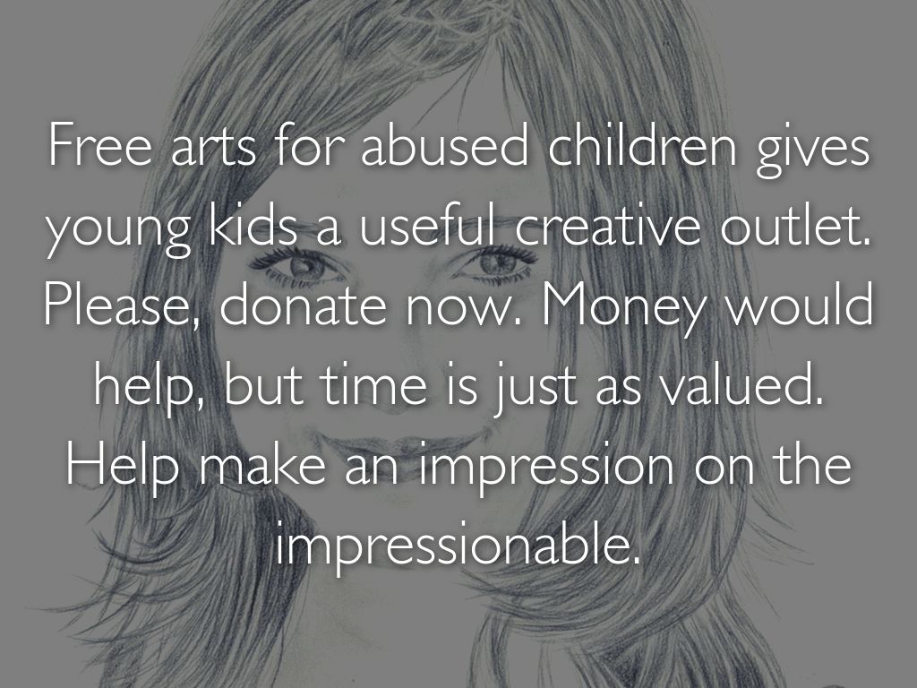 Free arts for abused children gives young kids a useful creative outlet. Please, donate now. Money would help, but time is just as valued. Help make an impression on the impressionable.