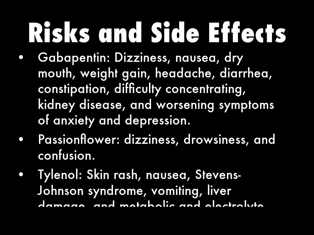 • Gabapentin: Dizziness, nausea, dry mouth, weight gain, headache, diarrhea, constipation, difficulty concentrating, kidney disease, and worsening symptoms of anxiety and depression.