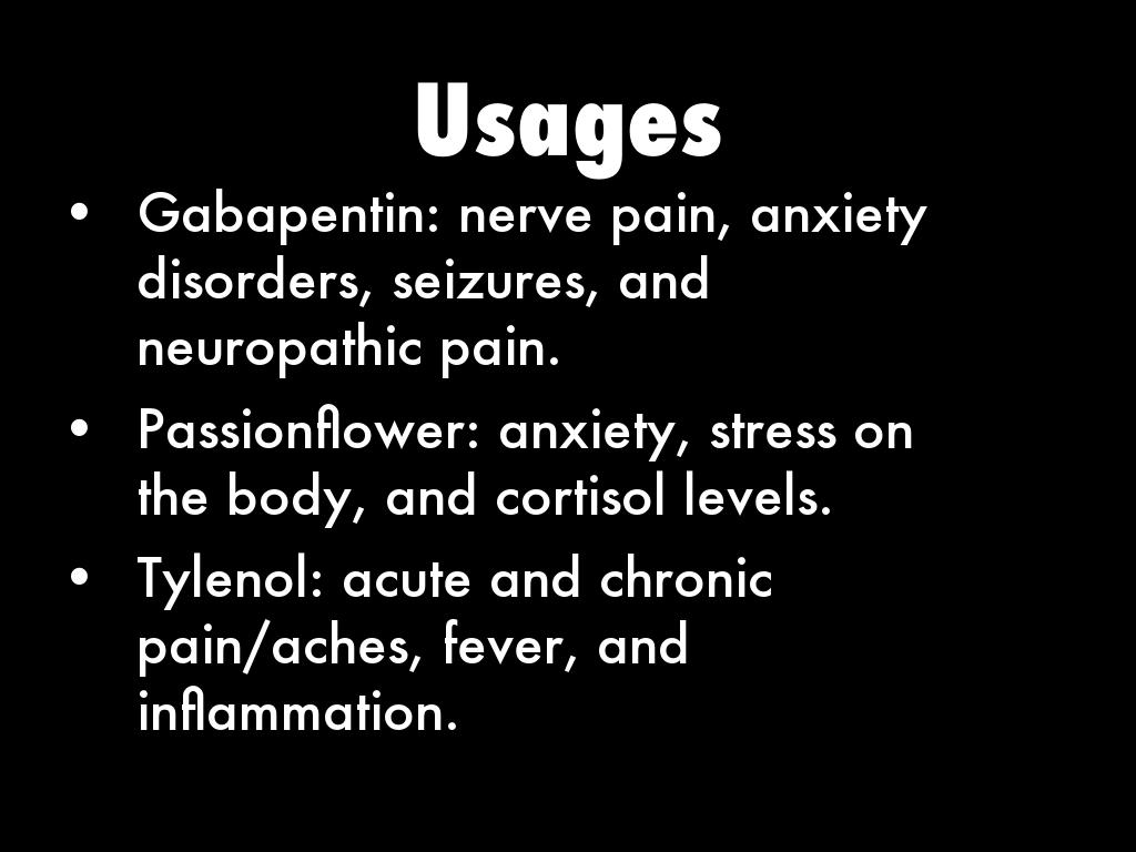 • Gabapentin: Reduction in nerve pain, decrease feelings of anxiety and social anxiety, controls seizures, decrease of neuropathic pain.