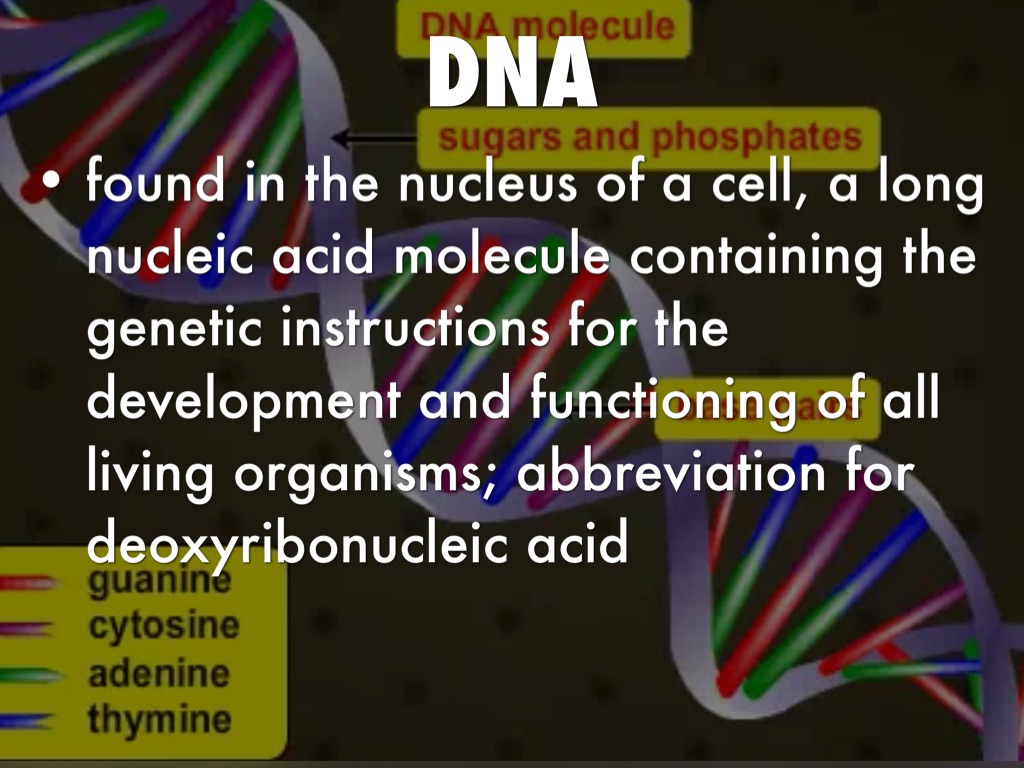• found in the nucleus of a cell, a long nucleic acid molecule containing the genetic instructions for the development and functioning of all living organisms; abbreviation for deoxyribonucleic acid
