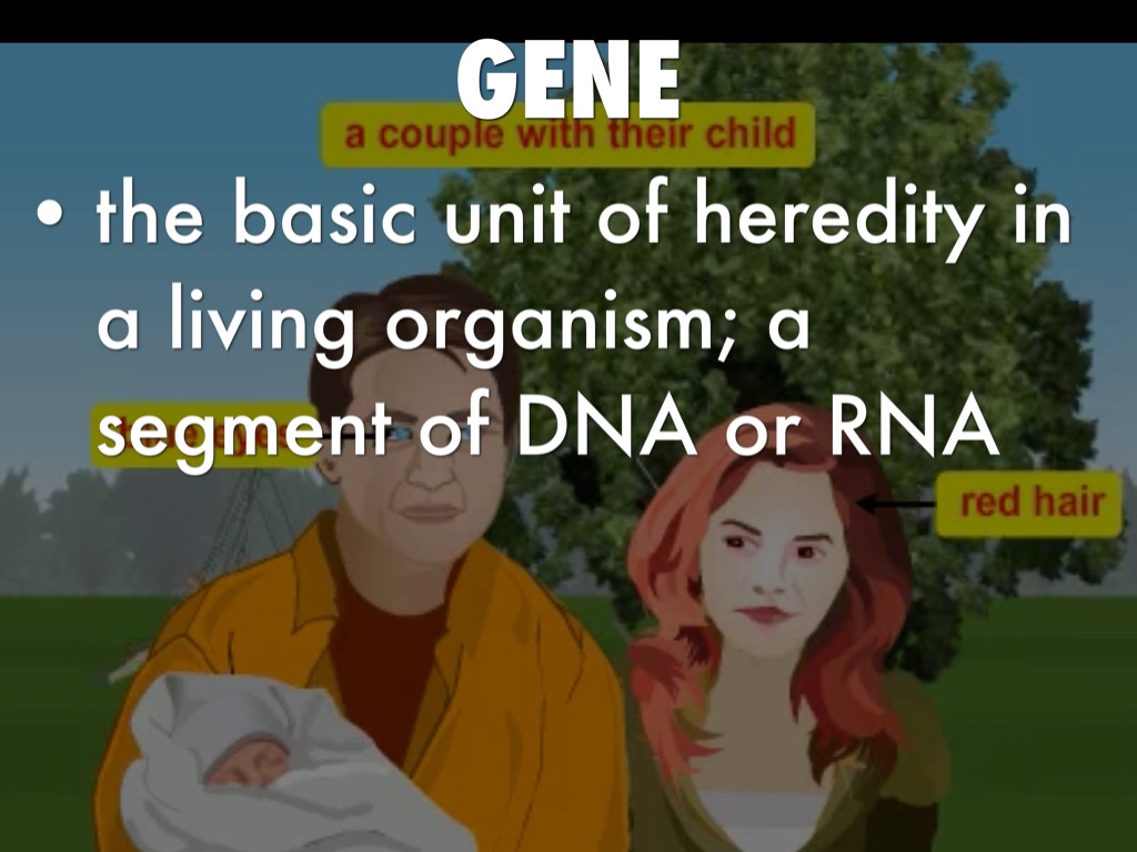 • the basic unit of heredity in a living organism; a segment of DNA or RNA