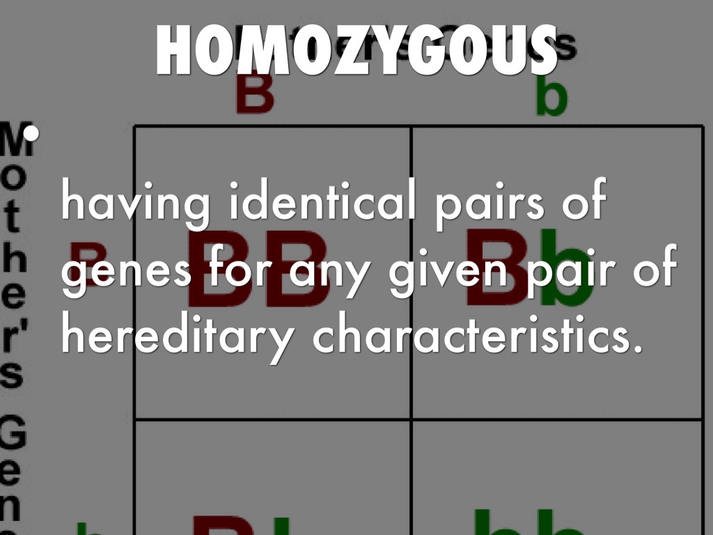 • having identical pairs of genes for any given pair of hereditary characteristics.