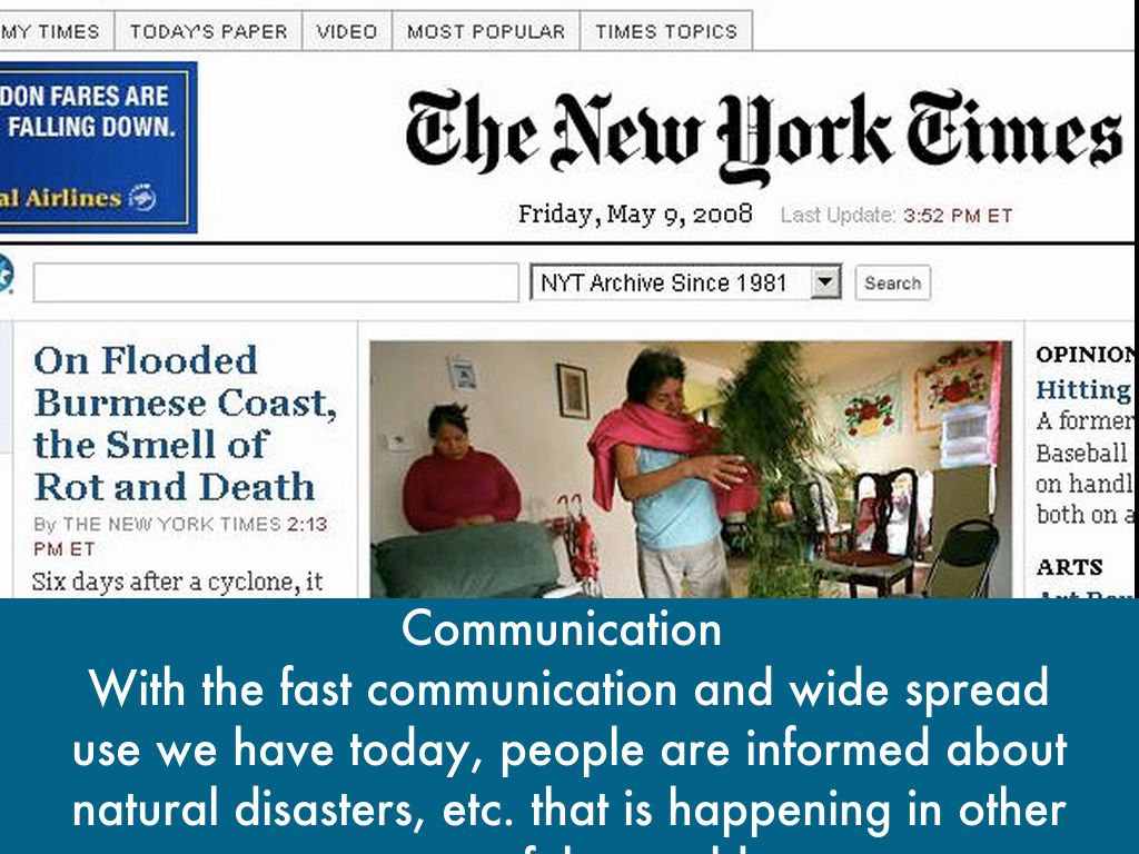 With the fast communication and wide spread use we have today, people are informed about natural disasters, etc. that is happening in other parts of the world.