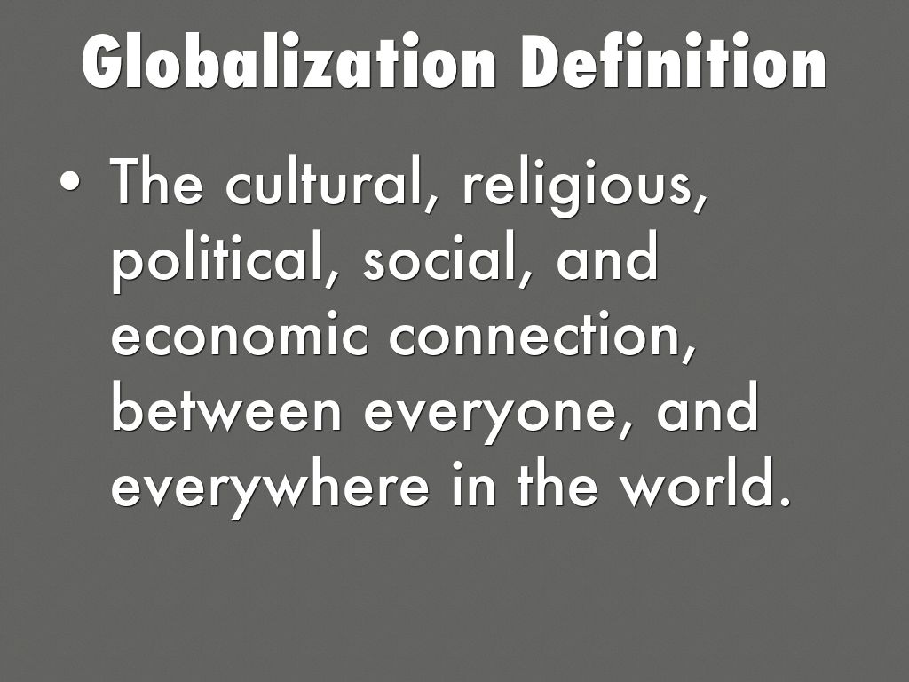 - The cultural, religious, political, social, and economic connection, between everyone, and everywhere in the world.