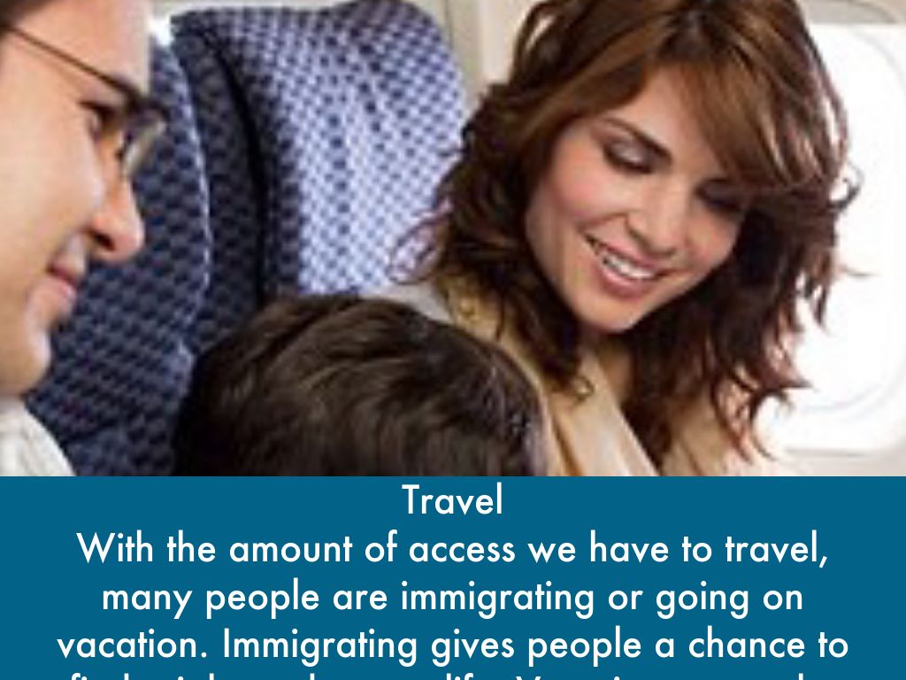 With the amount of access we have to travel, many people are immigrating or going on vacation. Immigrating gives people a chance to find a job, and start a life. Vacation opens the opportunity to experience other cultures. This image represents this because it shows a family traveling somewhere, using transportation. I think this is Economic and Social. Economic because it usually costs money to fly, or have a car. Or because many people immigrate to get a job. Social because you need to interact with people to be able to travel. Like the flight attendants, the pilot, etc..