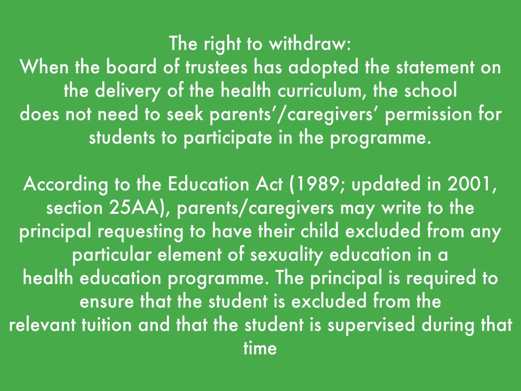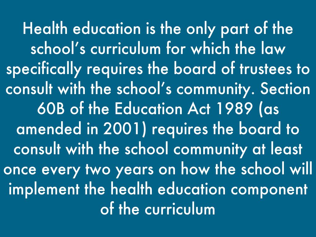 Health education is the only part of the school’s curriculum for which the law specifically requires the board of trustees to consult with the school’s community. Section 60B of the Education Act 1989 (as amended in 2001) requires the board to consult with the school community at least once every two years on how the school will implement the health education component of the curriculum