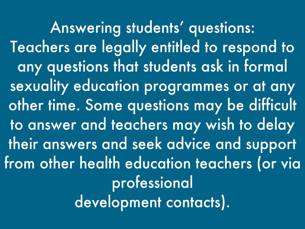 Teachers are legally entitled to respond to any questions that students ask in formal sexuality education programmes or at any other time. Some questions may be difficult to answer and teachers may wish to delay their answers and seek advice and support from other health education teachers (or via professional