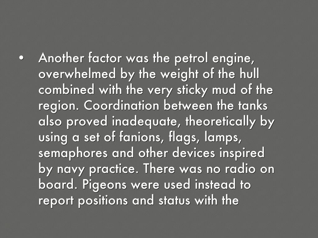 • Another factor was the petrol engine, overwhelmed by the weight of the hull combined with the very sticky mud of the region. Coordination between the tanks also proved inadequate, theoretically by using a set of fanions, flags, lamps, semaphores and other devices inspired by navy practice. There was no radio on board. Pigeons were used instead to report positions and status with the General Headquarters.