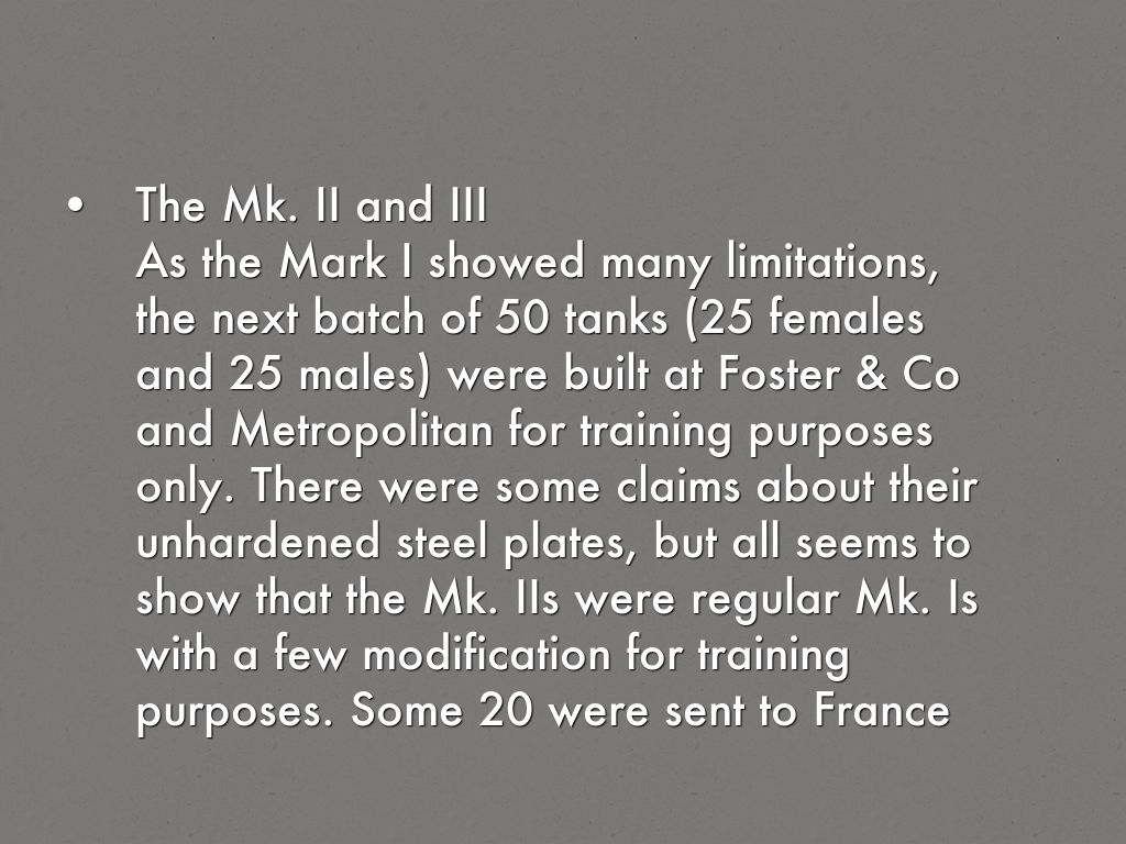 • The Mk. II and III As the Mark I showed many limitations, the next batch of 50 tanks (25 females and 25 males) were built at Foster & Co and Metropolitan for training purposes only. There were some claims about their unhardened steel plates, but all seems to show that the Mk. IIs were regular Mk. Is with a few modification for training purposes.