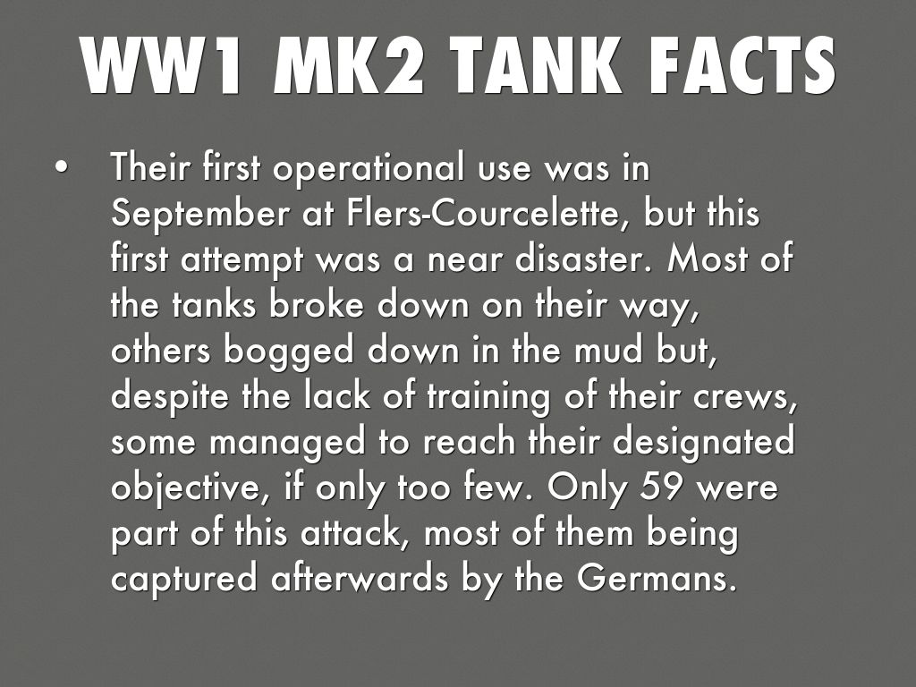 • Their first operational use was in September at Flers-Courcelette, but this first attempt was a near disaster. Most of the tanks broke down on their way, others bogged down in the mud but, despite the lack of training of their crews, some managed to reach their designated objective, if only too few. Only 59 were part of this attack, most of them being captured afterwards by the Germans. The first issues quickly arrived at the war office.