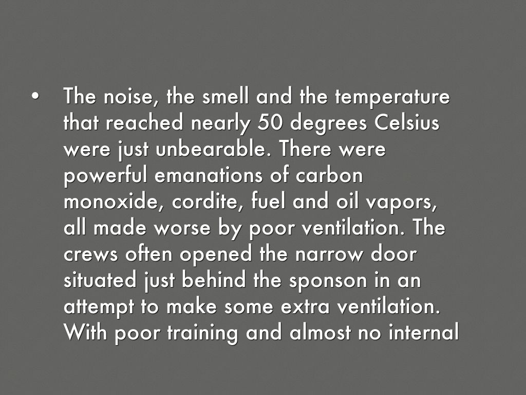 • The noise, the smell and the temperature that reached nearly 50 degrees Celsius were just unbearable. There were powerful emanations of carbon monoxide, cordite, fuel and oil vapors, all made worse by poor ventilation. The crews often opened the narrow door situated just behind the sponson in an attempt to make some extra ventilation. With poor training and almost no internal communication steering was enormously difficult.
