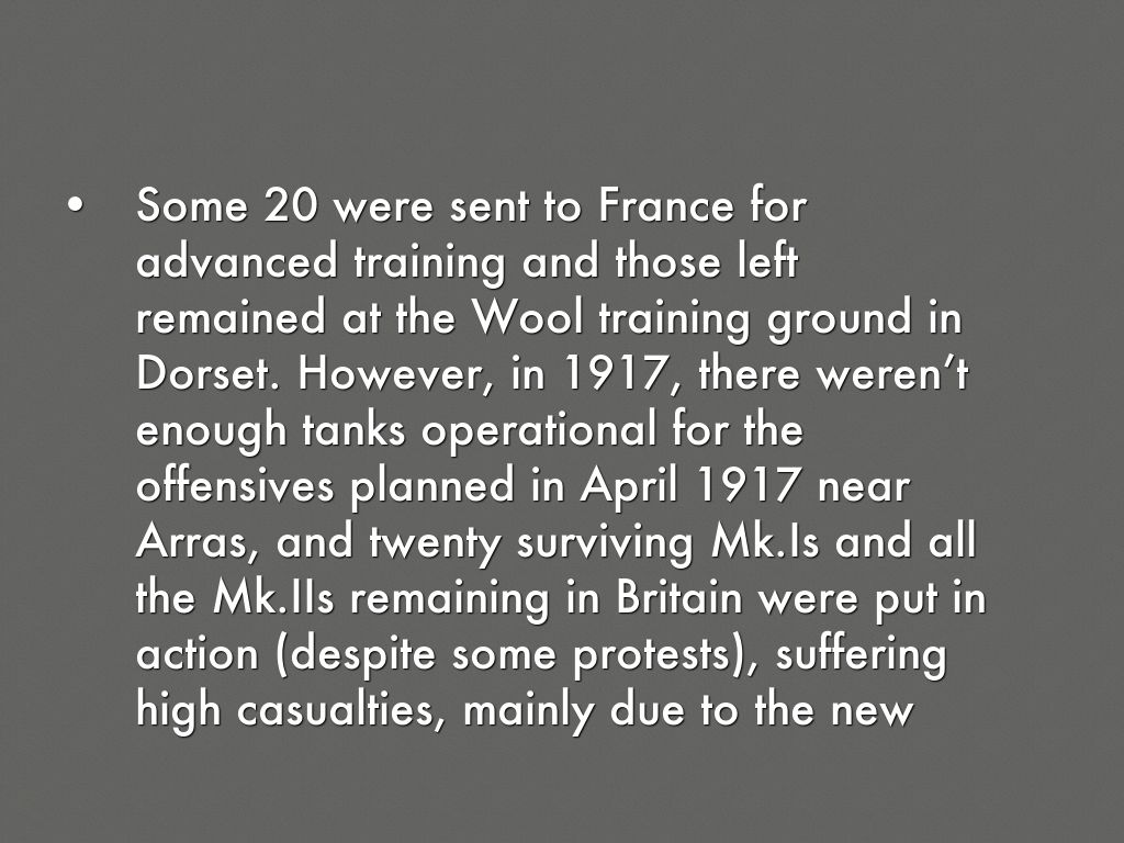 • Some 20 were sent to France for advanced training and those left remained at the Wool training ground in Dorset. However, in 1917, there weren’t enough tanks operational for the offensives planned in April 1917 near Arras, and twenty surviving Mk.Is and all the Mk.IIs remaining in Britain were put in action (despite some protests), suffering high casualties, mainly due to the new armor-piercing bullets the Germans employed.