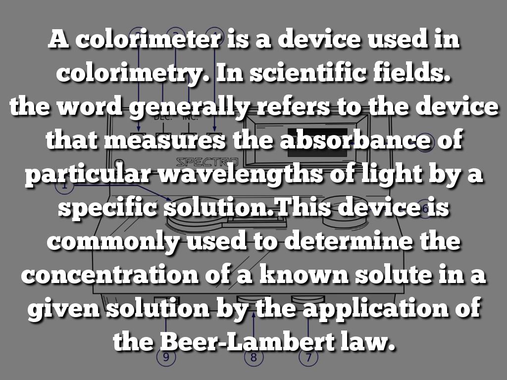 the word generally refers to the device that measures the absorbance of particular wavelengths of light by a specific solution.This device is commonly used to determine the concentration of a known solute in a given solution by the application of the Beer-Lambert law.