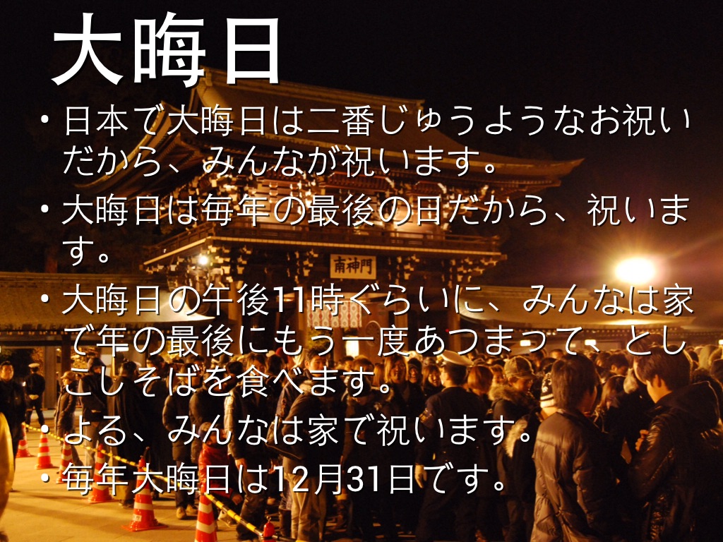 日本で大晦日は二番じゅうようなお祝いだから、みんなが祝います。