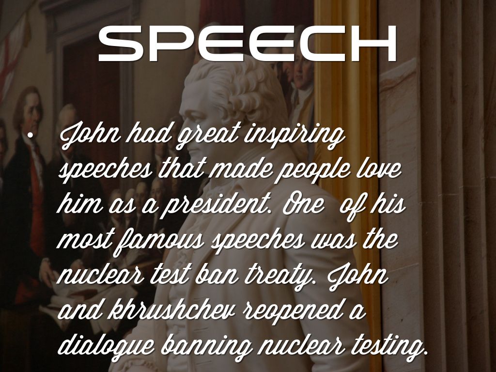 John had great inspiring speeches that made people love him as a president. One of his most famous speeches was the nuclear test ban treaty. John and khrushchev reopened a dialogue banning nuclear testing.