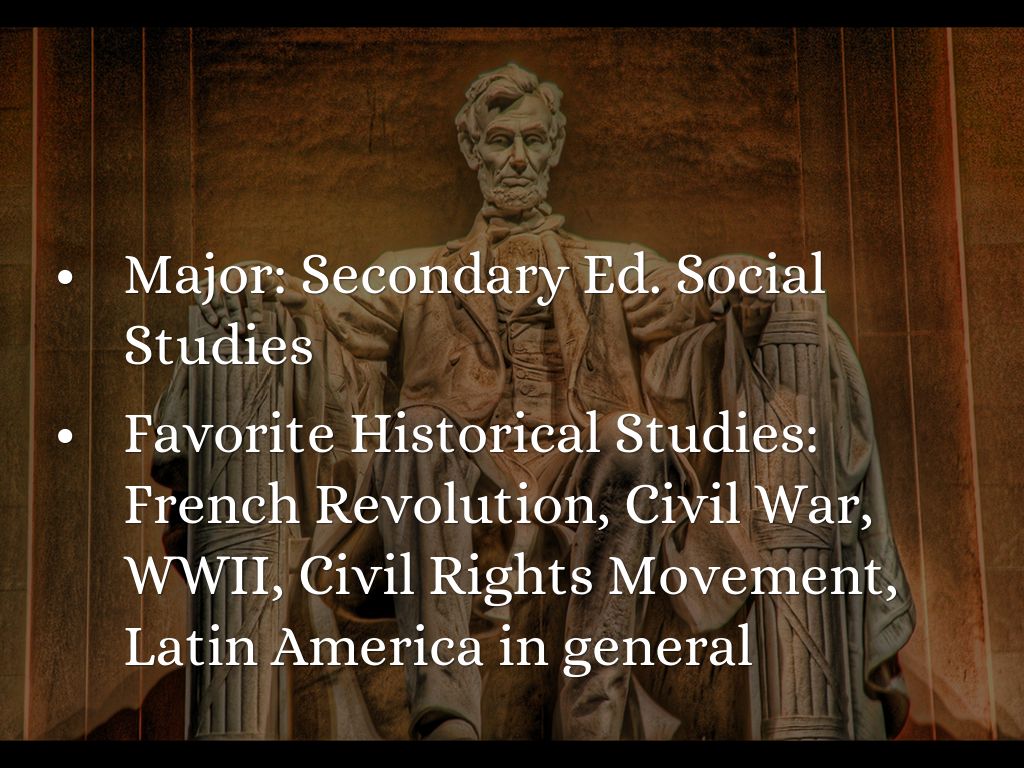 Favorite Historical Studies: French Revolution, Civil War, WWII, Civil Rights Movement, Latin America in general