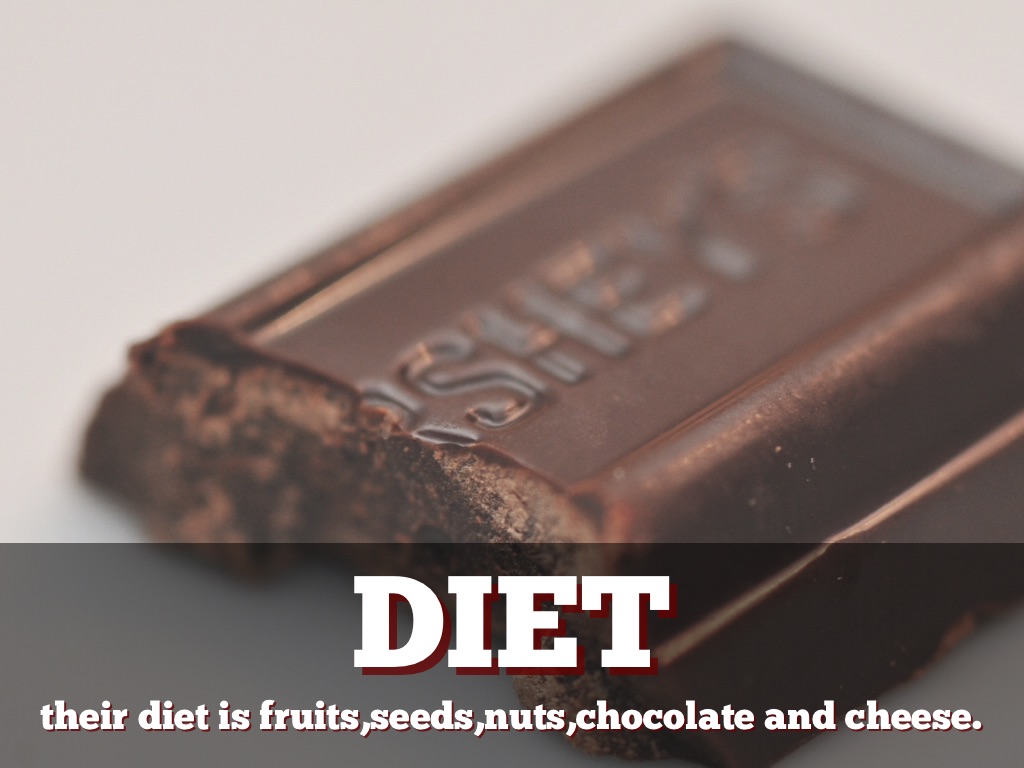 their diet is fruits,seeds,nuts,chocolate and cheese.