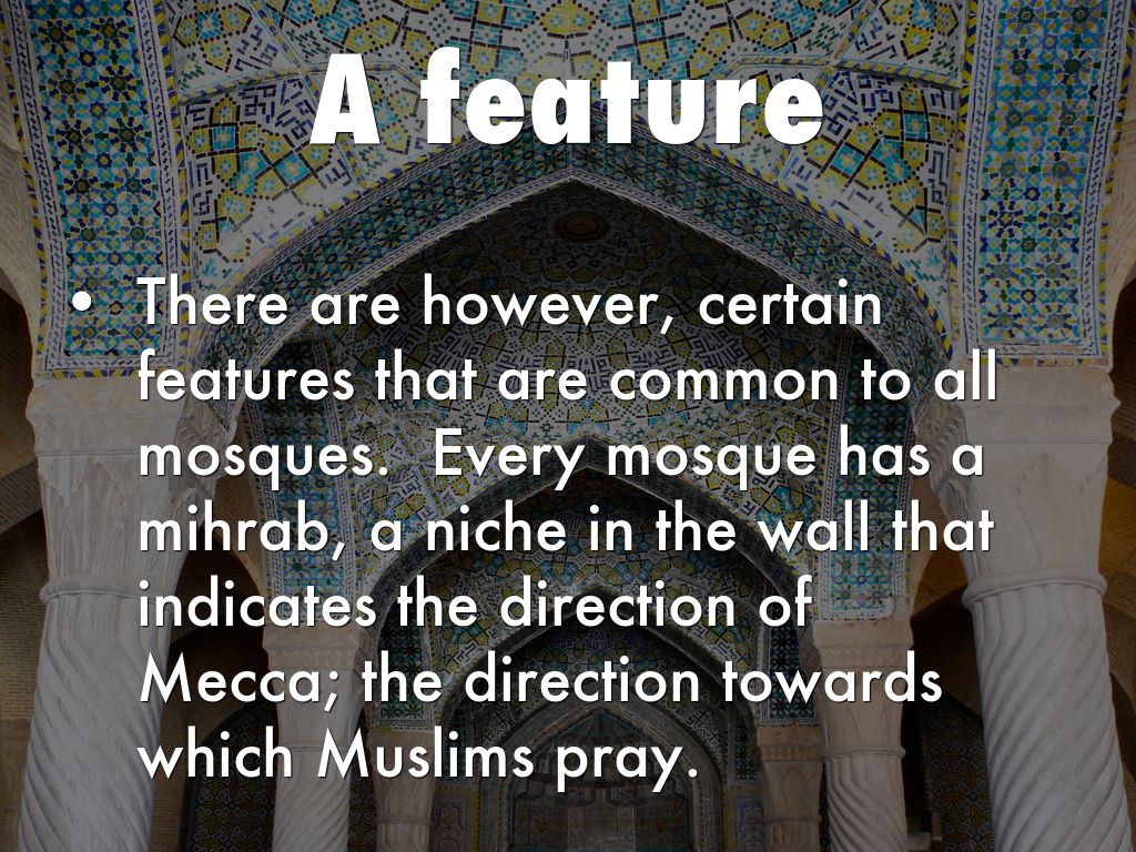 There are however, certain features that are common to all mosques. Every mosque has a mihrab, a niche in the wall that indicates the direction of Mecca; the direction towards which Muslims pray.