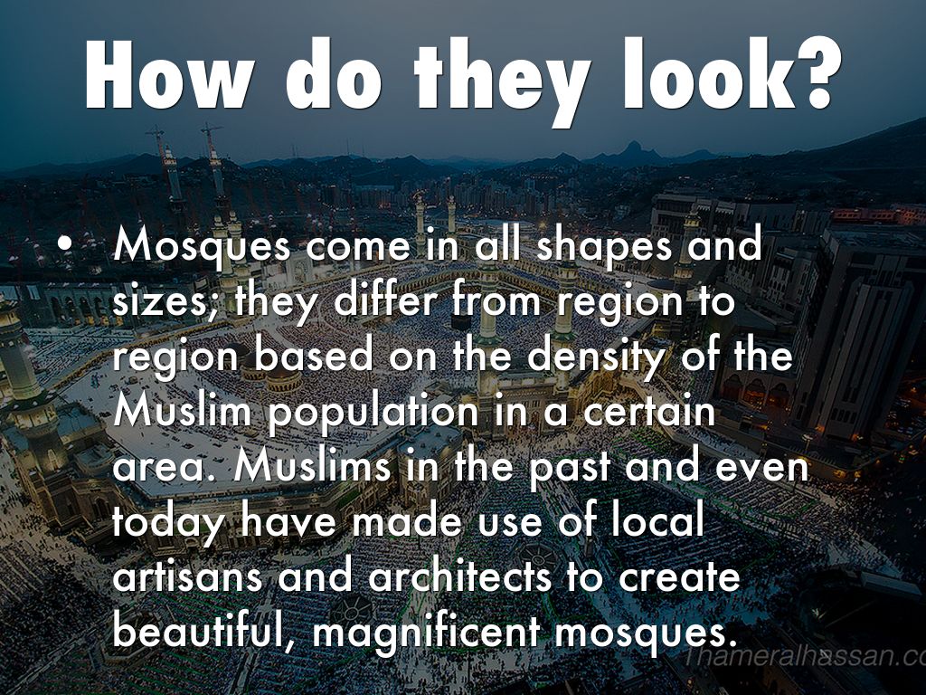 Mosques come in all shapes and sizes; they differ from region to region based on the density of the Muslim population in a certain area. Muslims in the past and even today have made use of local artisans and architects to create beautiful, magnificent mosques.