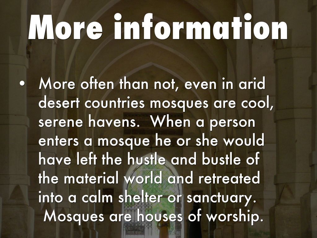 More often than not, even in arid desert countries mosques are cool, serene havens. When a person enters a mosque he or she would have left the hustle and bustle of the material world and retreated into a calm shelter or sanctuary. Mosques are houses of worship.