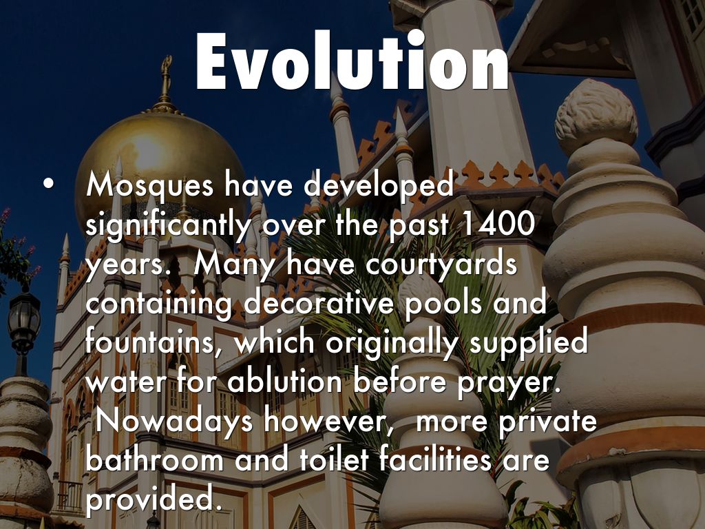 Mosques have developed significantly over the past 1400 years. Many have courtyards containing decorative pools and fountains, which originally supplied water for ablution before prayer. Nowadays however, more private bathroom and toilet facilities are provided.
