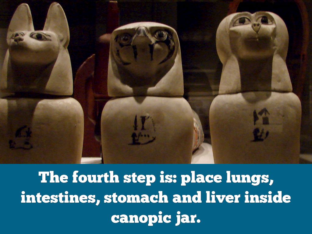 The fourth step is: place lungs, intestines, stomach and liver inside canopic jar.