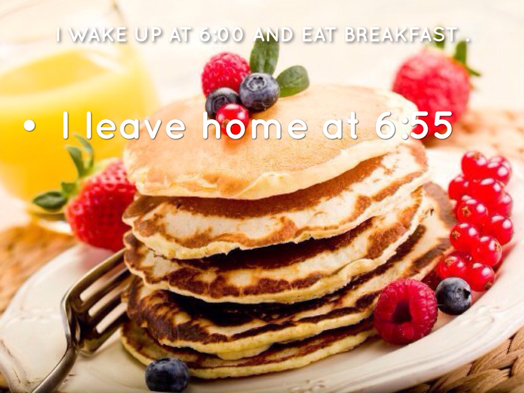 I WAKE UP AT 6:00 AND EAT BREAKFAST .