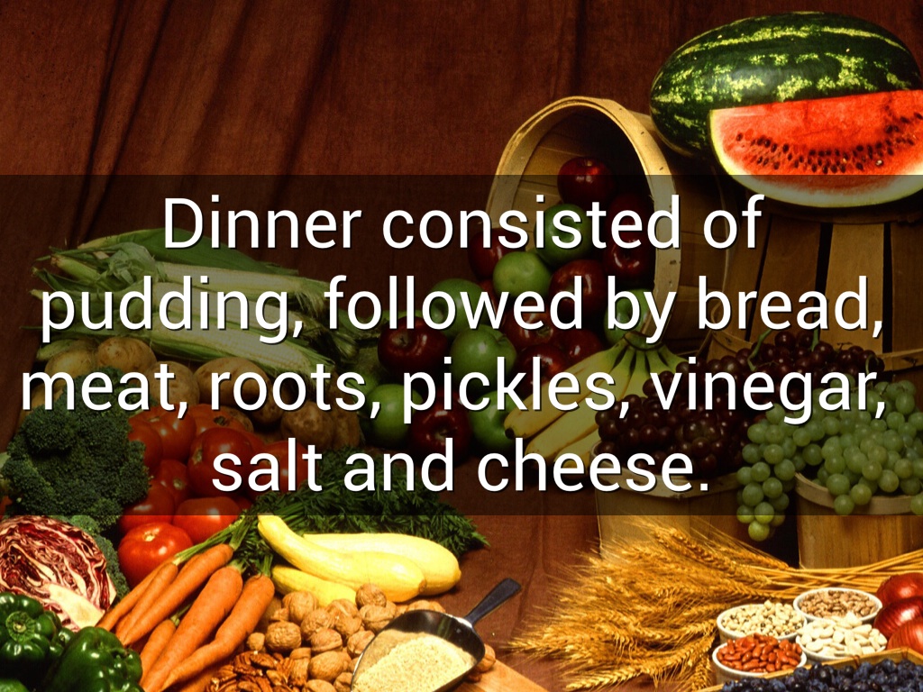 Dinner consisted of pudding, followed by bread, meat, roots, pickles, vinegar, salt and cheese.