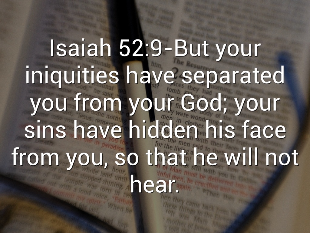 Isaiah 52:9-But your iniquities have separated you from your God; your sins have hidden his face from you, so that he will not hear.