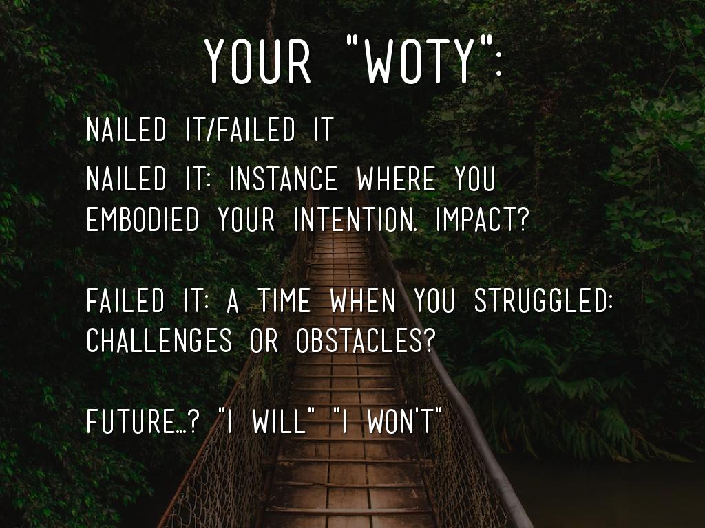Nailed it: instance where you embodied your intention. impact? Failed it: A time when you struggled: challenges or obstacles? Future...? "I will" "I won't"