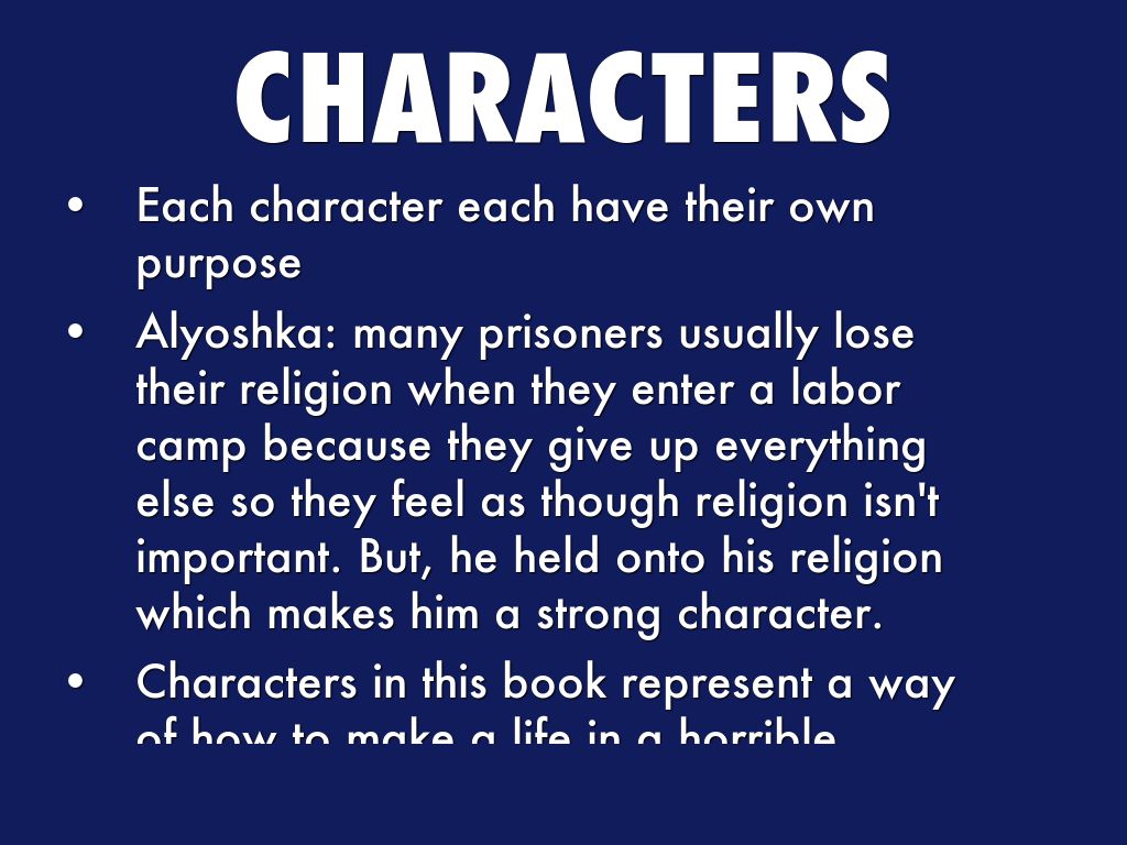 Alyoshka: many prisoners usually lose their religion when they enter a labor camp because they give up everything else so they feel as though religion isn't important. But, he held onto his religion which makes him a strong character.