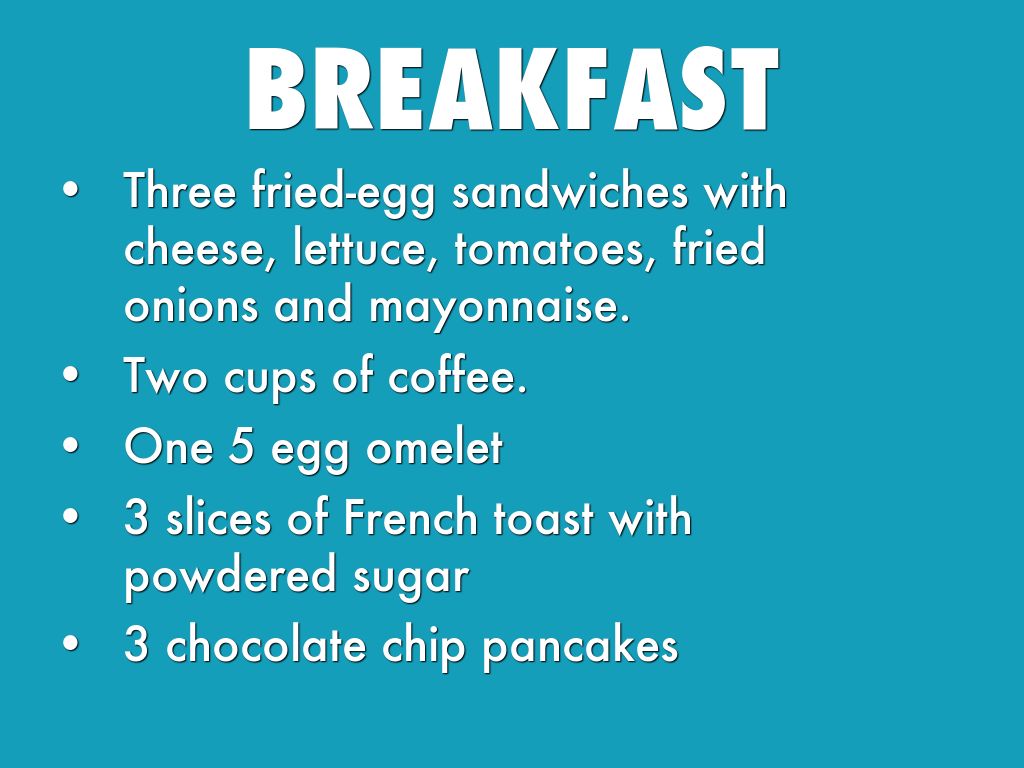 • Three fried-egg sandwiches with cheese, lettuce, tomatoes, fried onions and mayonnaise.