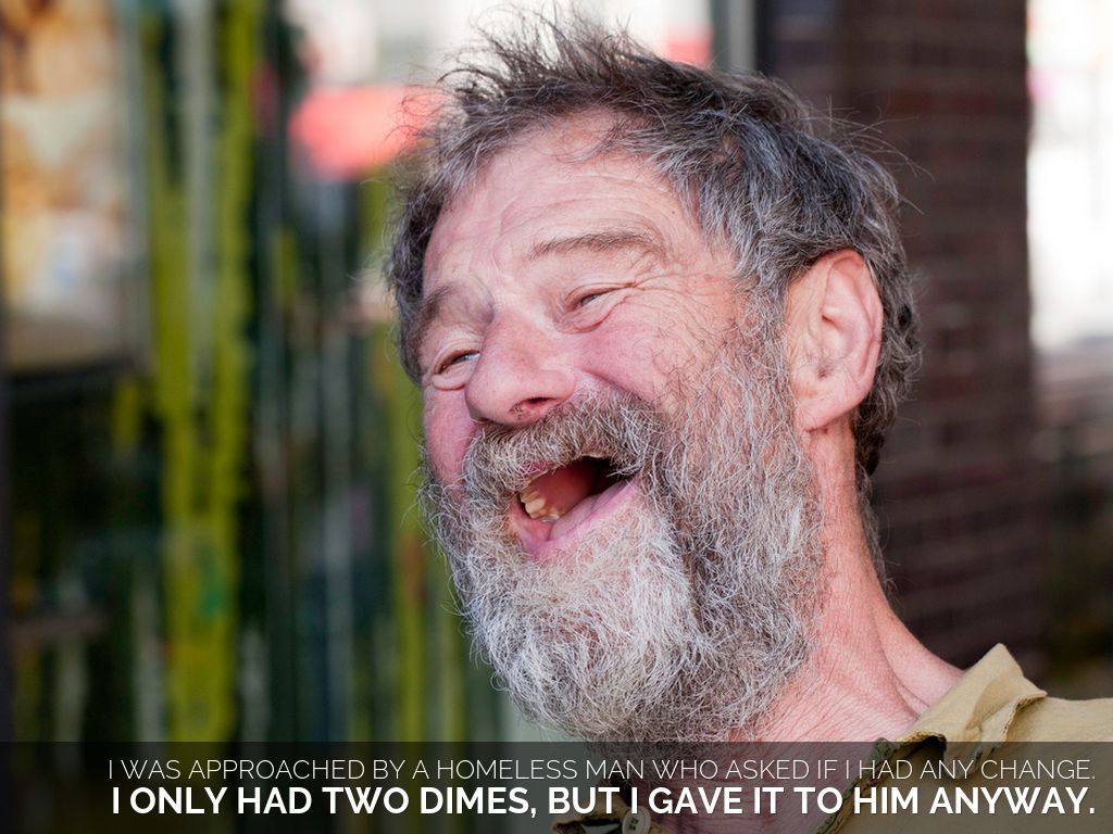 I WAS APPROACHED BY A HOMELESS MAN WHO ASKED IF I HAD ANY CHANGE.