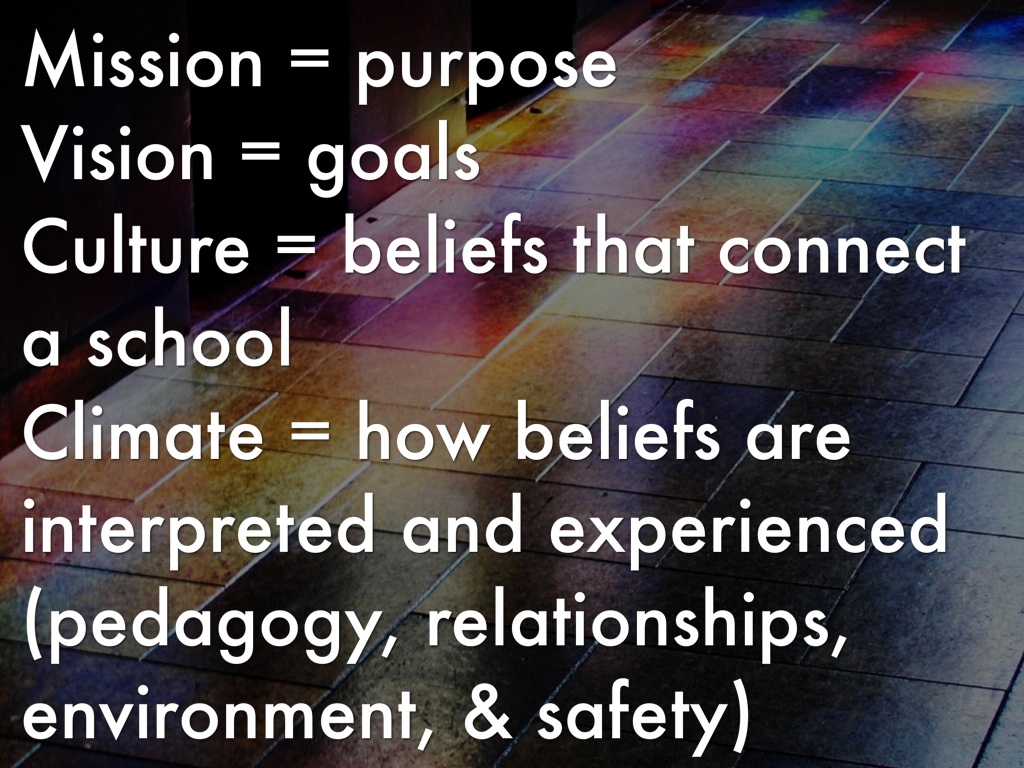 Climate = how beliefs are interpreted and experienced (pedagogy, relationships, environment, & safety)