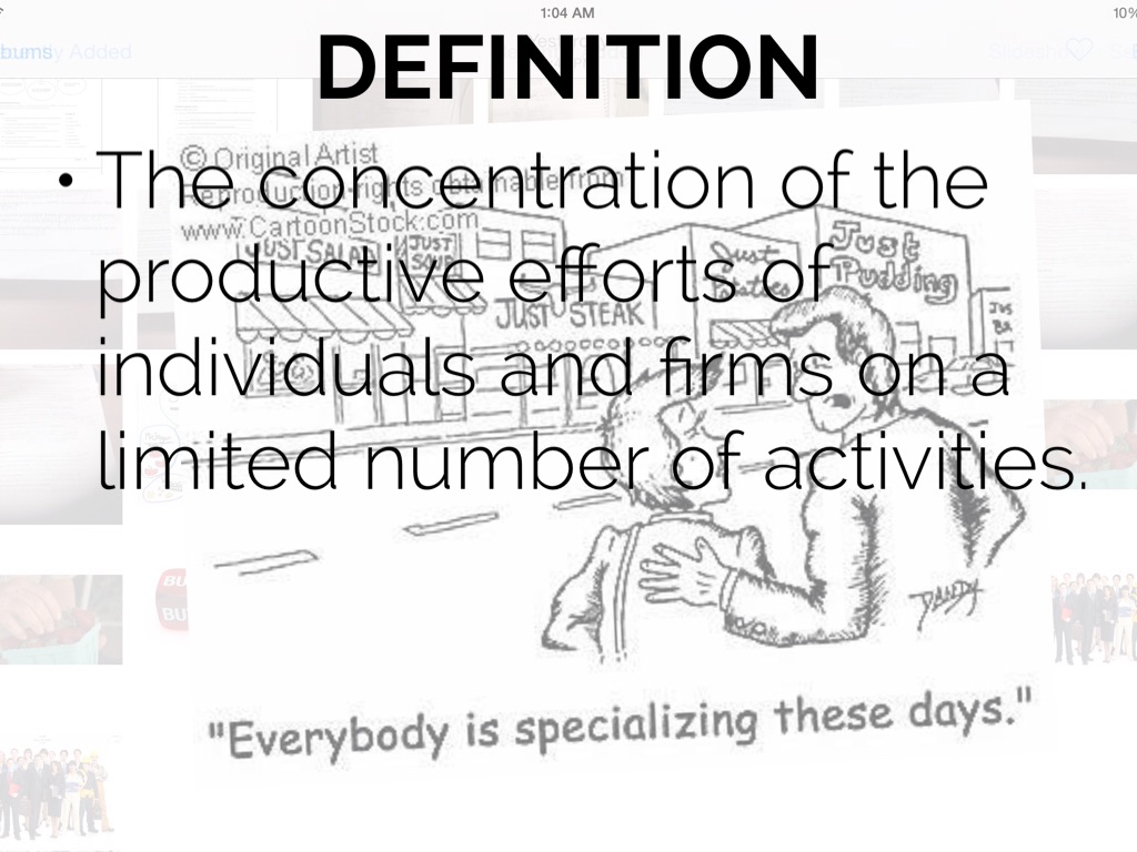 The concentration of the productive efforts of individuals and firms on a limited number of activities.