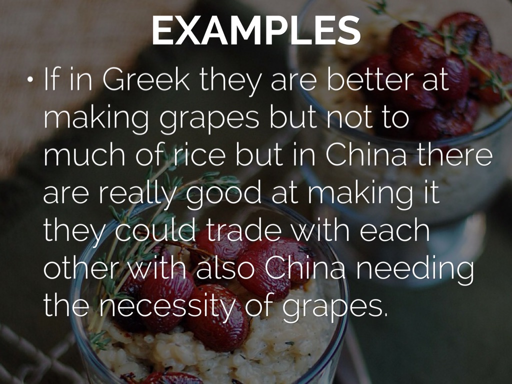 If in Greek they are better at making grapes but not to much of rice but in China there are really good at making it they could trade with each other with also China needing the necessity of grapes.