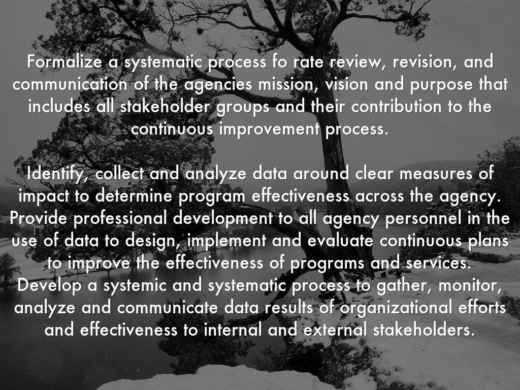 Formalize a systematic process fo rate review, revision, and communication of the agencies mission, vision and purpose that includes all stakeholder groups and their contribution to the continuous improvement process.