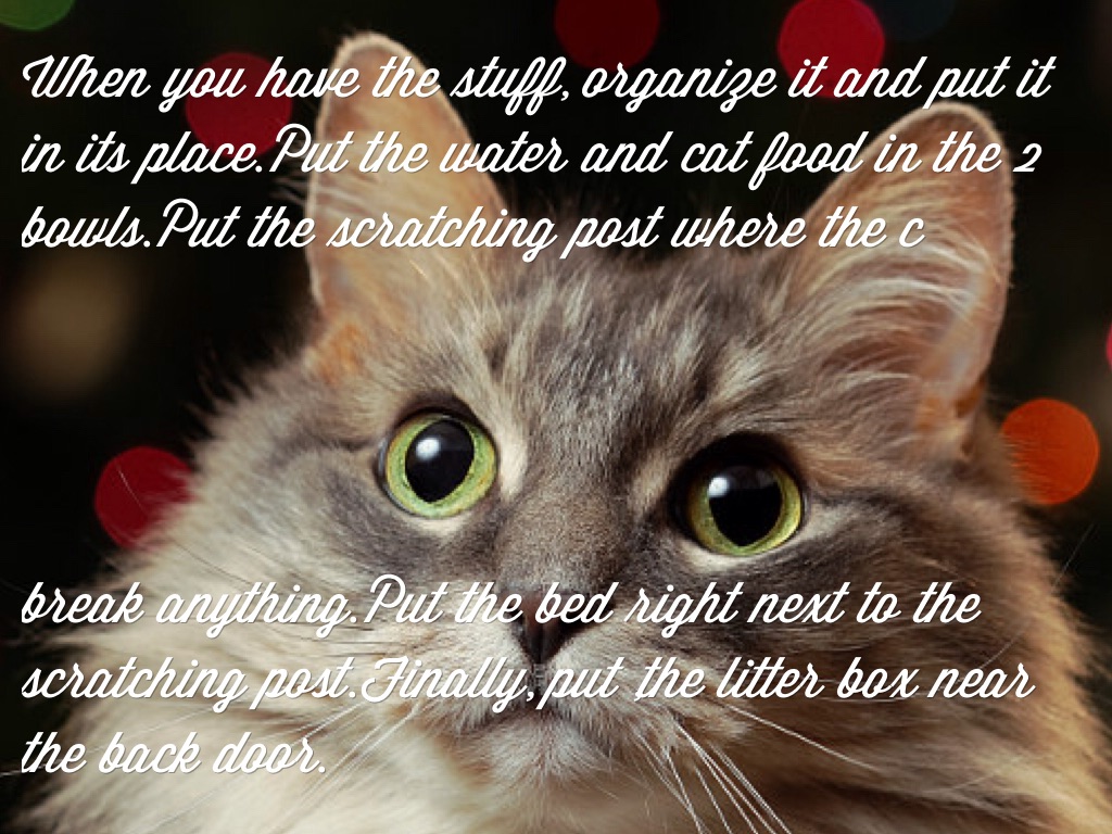 When you have the stuff, organize it and put it in its place.Put the water and cat food in the 2 bowls.Put the scratching post where the c